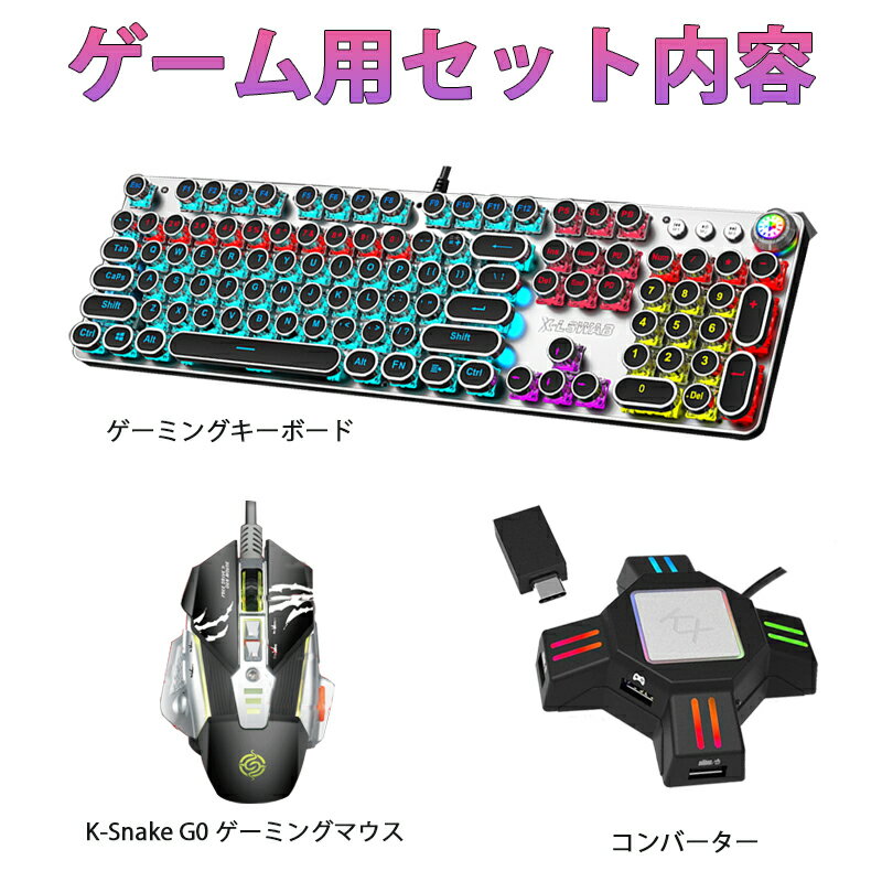 【ゲーム3点セット】ゲーミングキーボード&ゲーミングマウス&コンバーター 【ゲーム3点セット】ゲーミングキーボード&ゲーミングマウス&コンバーター 有線ゲーミングキーボード仕様 ◆ カラー:ブラック、ホワイト ◆キーボードサイズ:約W420×D120×H20mm ◆ インターフェイス:USB ◆ キー配列:英語配列104キー ◆ ケーブル長:(キーボード)約1.3m ◆ 対応機種:USBポートを装備したWindows OS搭載機 【104キーメカニカル式青軸ゲーミングキーボード】 ●各々のキーは独立した高品質の青軸スイッチにより制御され、複数のキーを同時に押しても干渉しません。